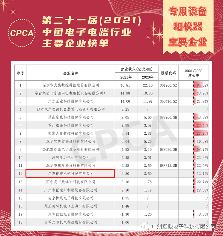5月18日,由中國電子信息行業(yè)聯(lián)合會(huì)和中國電子電路行業(yè)協(xié)會(huì)聯(lián)合發(fā)布了第二十一屆(2021)中國電子電路行業(yè)主要企業(yè)榜單,“廣東捷駿”以出色的表現(xiàn),榮登“專用設(shè)備和儀器主要企業(yè)”榜單。
